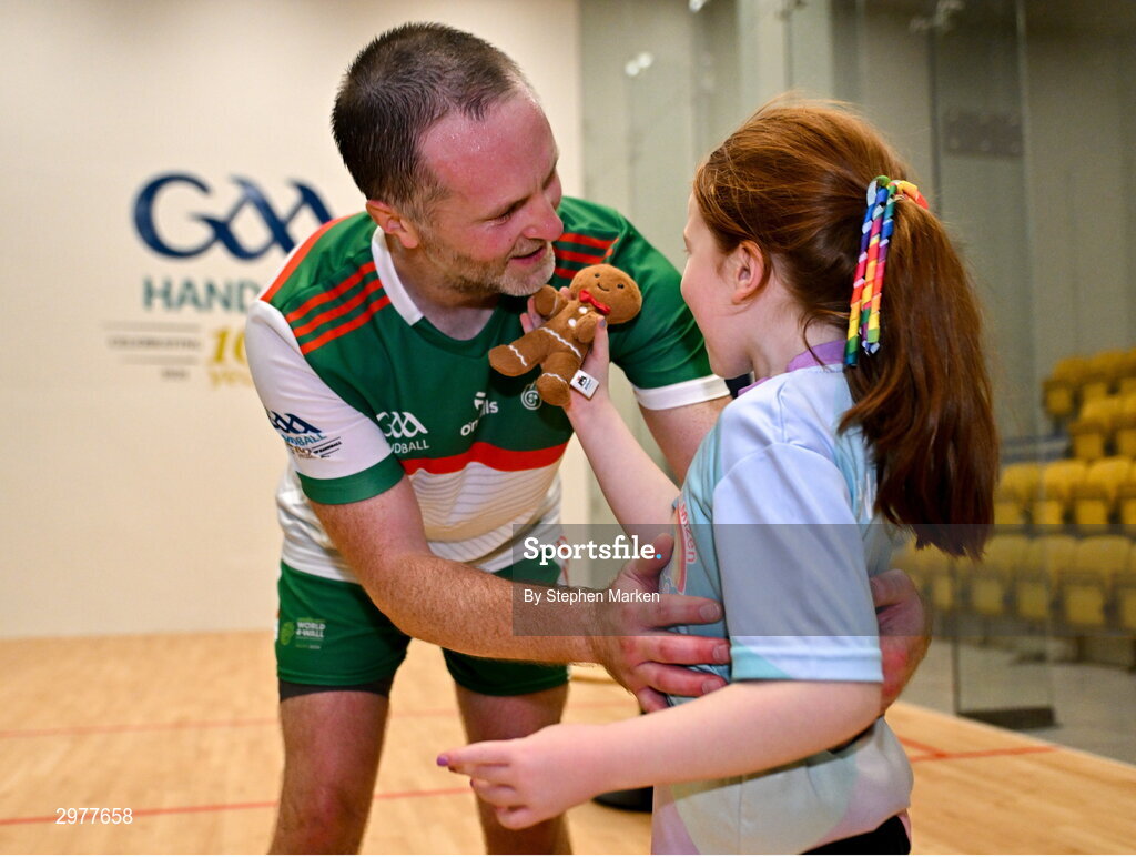 3 November 2024; Joe McCann of Team Ireland is congratulated after his victory in the Men's Open doubles final by his daugther Clodagh, age 7, with a teddy belonging to her late brother CJ during day nine of the O'Neills.com World 4-Wall Championships at Croke Park in Dublin. Photo by Stephen Marken/Sportsfile