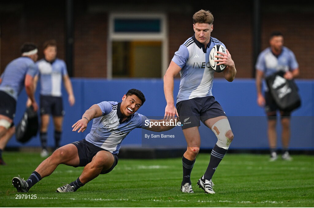6 November 2024; Jordie Barrett, right, and Caleb Clarke during a New Zealand rugby squad training session at Wanderers Football Club in Dublin. Photo by Sam Barnes/Sportsfile