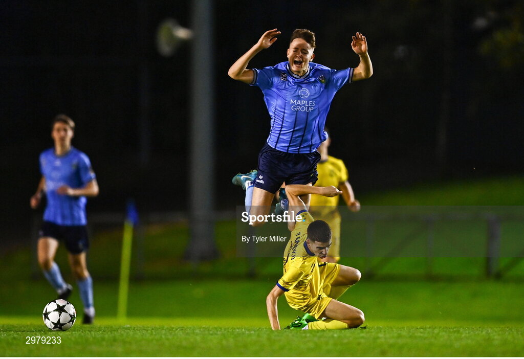 6 November 2024; Jamie Ryan of UCD is fouled by Donart Syla of 2 Korriku during the UEFA Youth League second round 2nd leg match between UCD and 2 Korriku at UCD Bowl in Dublin. Photo by Tyler Miller/Sportsfile