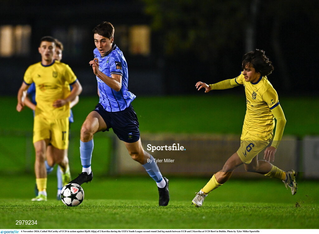 6 November 2024; Cathal McCarthy of UCD in action against Djelli Alijaj of 2 Korriku during the UEFA Youth League second round 2nd leg match between UCD and 2 Korriku at UCD Bowl in Dublin. Photo by Tyler Miller/Sportsfile