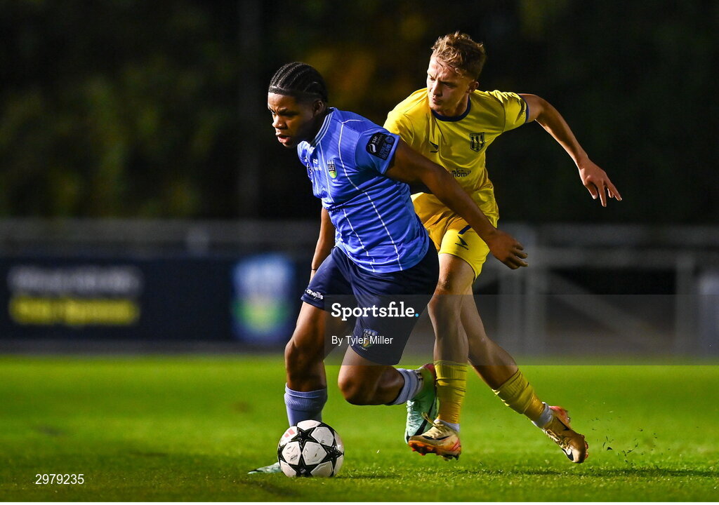 6 November 2024; Matthew Elonge of UCD in action against Leon Miftari of 2 Korriku during the UEFA Youth League second round 2nd leg match between UCD and 2 Korriku at UCD Bowl in Dublin. Photo by Tyler Miller/Sportsfile