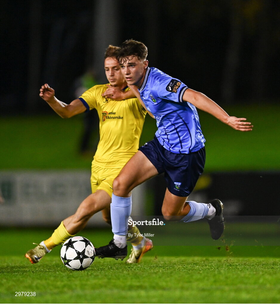 6 November 2024; Lorcan Moore of UCD in action against Leon Miftari of 2 Korriku during the UEFA Youth League second round 2nd leg match between UCD and 2 Korriku at UCD Bowl in Dublin. Photo by Tyler Miller/Sportsfile