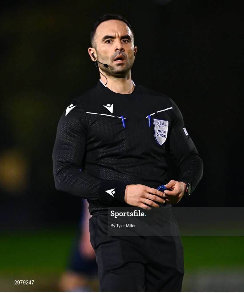 6 November 2024; Referee Andreas Argyrou during the UEFA Youth League second round 2nd leg match between UCD and 2 Korriku at UCD Bowl in Dublin. Photo by Tyler Miller/Sportsfile