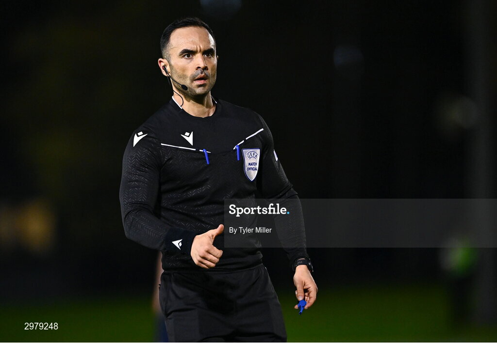 6 November 2024; Referee Andreas Argyrou during the UEFA Youth League second round 2nd leg match between UCD and 2 Korriku at UCD Bowl in Dublin. Photo by Tyler Miller/Sportsfile