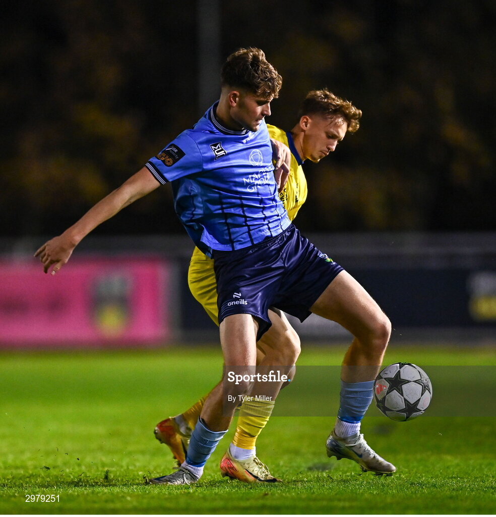 6 November 2024; Hugh Parker of UCD in action against Leon Miftari of 2 Korriku during the UEFA Youth League second round 2nd leg match between UCD and 2 Korriku at UCD Bowl in Dublin. Photo by Tyler Miller/Sportsfile