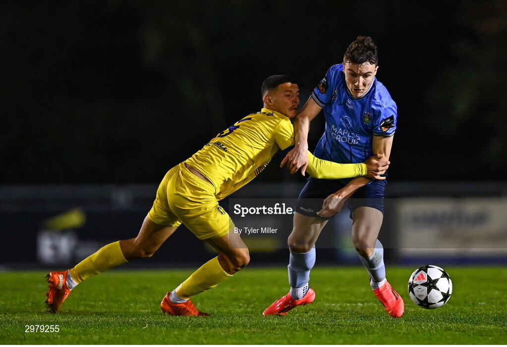 6 November 2024; Jake Doyle of UCD in action against Lis Berisha of 2 Korriku during the UEFA Youth League second round 2nd leg match between UCD and 2 Korriku at UCD Bowl in Dublin. Photo by Tyler Miller/Sportsfile
