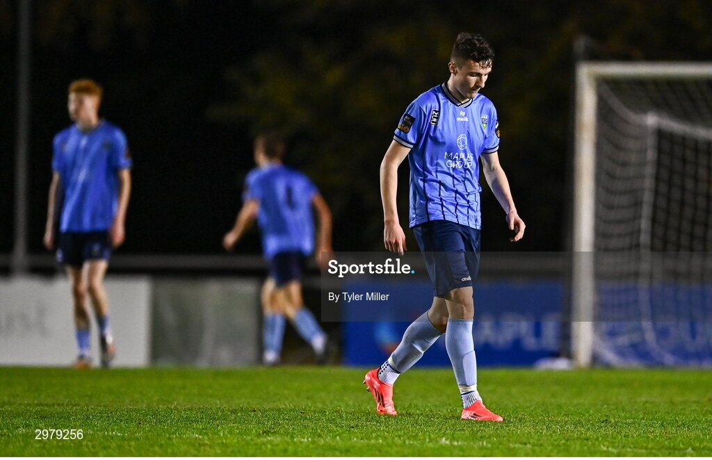 6 November 2024; Jake Doyle of UCD reacts after his side concede their second goal during the UEFA Youth League second round 2nd leg match between UCD and 2 Korriku at UCD Bowl in Dublin. Photo by Tyler Miller/Sportsfile