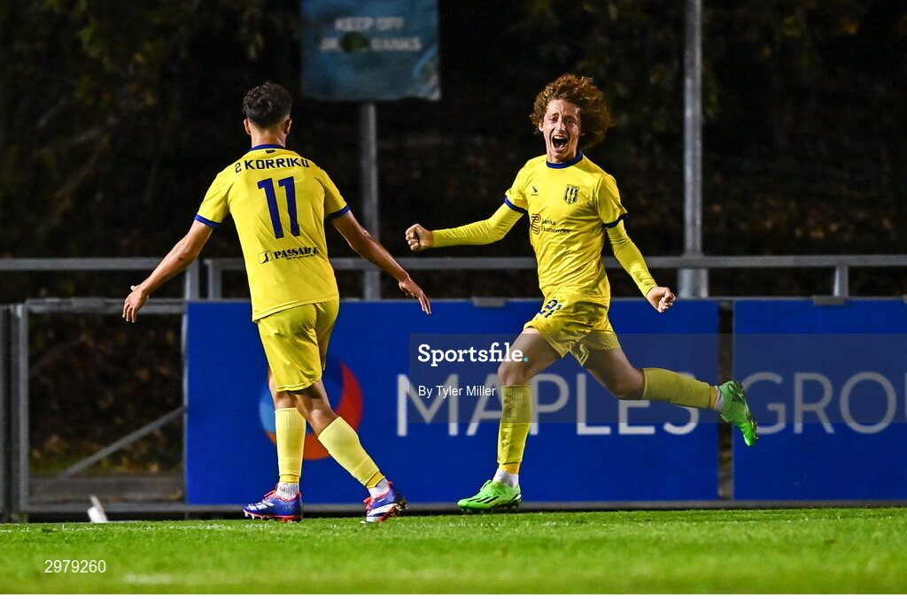 6 November 2024; Omer Shala of 2 Korriku, right, celebrates after scoring his side's third goal during the UEFA Youth League second round 2nd leg match between UCD and 2 Korriku at UCD Bowl in Dublin. Photo by Tyler Miller/Sportsfile