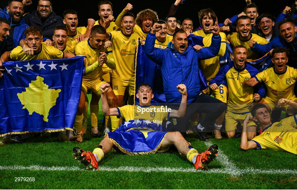 6 November 2024; The 2 Korriku team celebrate after their side's victory in the UEFA Youth League second round 2nd leg match between UCD and 2 Korriku at UCD Bowl in Dublin. Photo by Tyler Miller/Sportsfile
