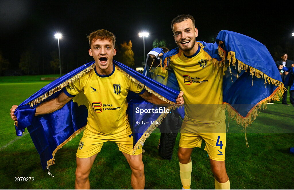 6 November 2024; Leon Miftari, let, and Nderim Abdullahu of 2 Korriku celebrate after the UEFA Youth League second round 2nd leg match between UCD and 2 Korriku at UCD Bowl in Dublin. Photo by Tyler Miller/Sportsfile