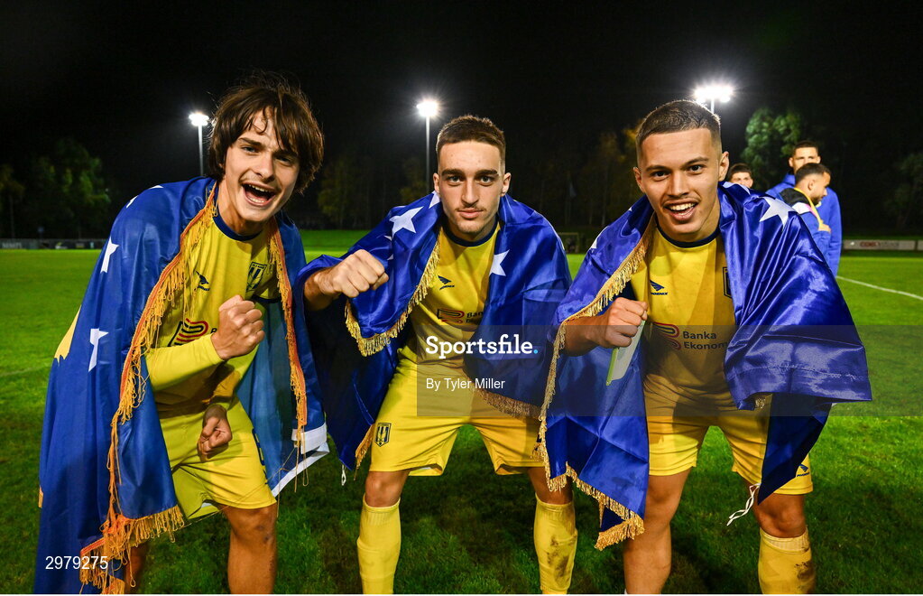 6 November 2024; 2 Korriku players, from left, Djelli Alijaj, Beart Zhubi and Daris Gashi celebrate after the UEFA Youth League second round 2nd leg match between UCD and 2 Korriku at UCD Bowl in Dublin. Photo by Tyler Miller/Sportsfile