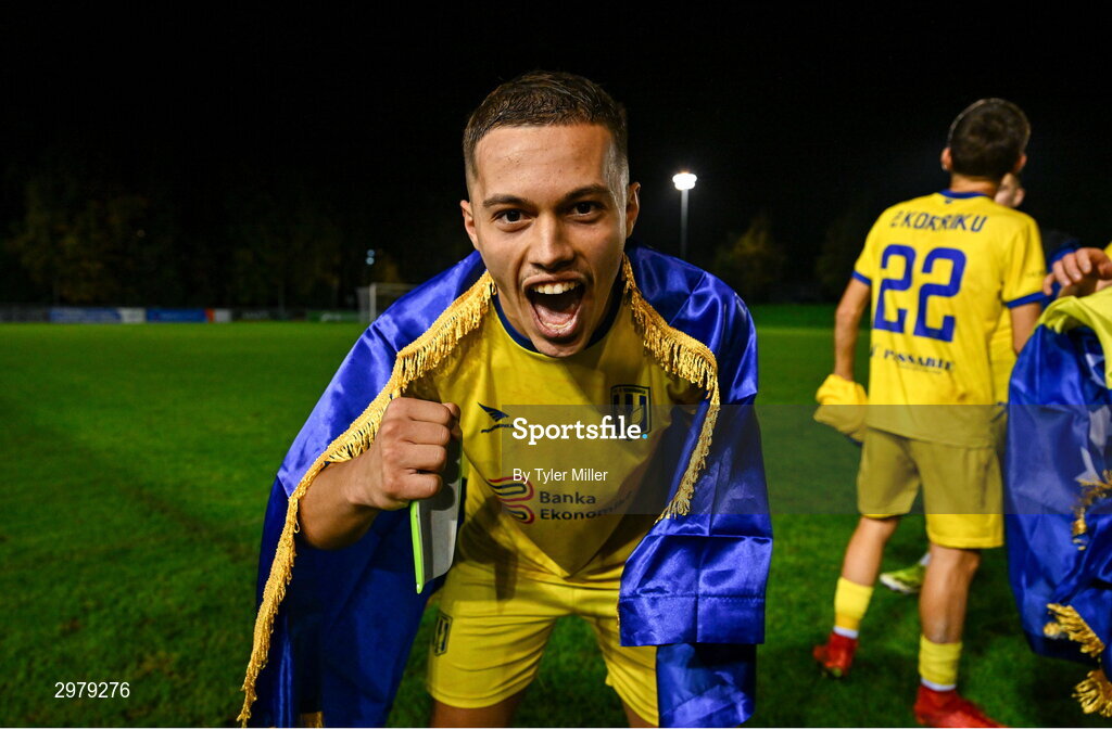 6 November 2024; Daris Gashi of 2 Korriku celebrates after the UEFA Youth League second round 2nd leg match between UCD and 2 Korriku at UCD Bowl in Dublin. Photo by Tyler Miller/Sportsfile