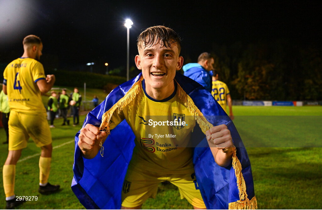 6 November 2024; Enes Hajrullahu of 2 Korriku celebrates after the UEFA Youth League second round 2nd leg match between UCD and 2 Korriku at UCD Bowl in Dublin. Photo by Tyler Miller/Sportsfile