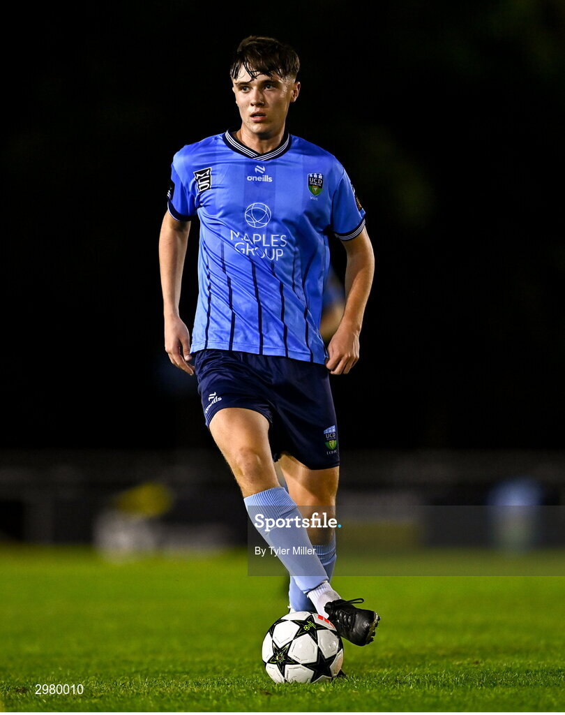 6 November 2024; Lorcan Moore of UCD during the UEFA Youth League second round 2nd leg match between UCD and 2 Korriku at UCD Bowl in Dublin. Photo by Tyler Miller/Sportsfile