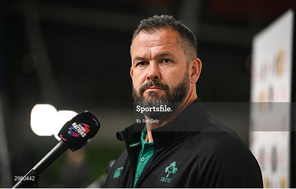 8 November 2024; Ireland head coach Andy Farrell is interviewed before the Autumn Nations Series match between Ireland and New Zealand at the Aviva Stadium in Dublin. Photo by Seb Daly/Sportsfile