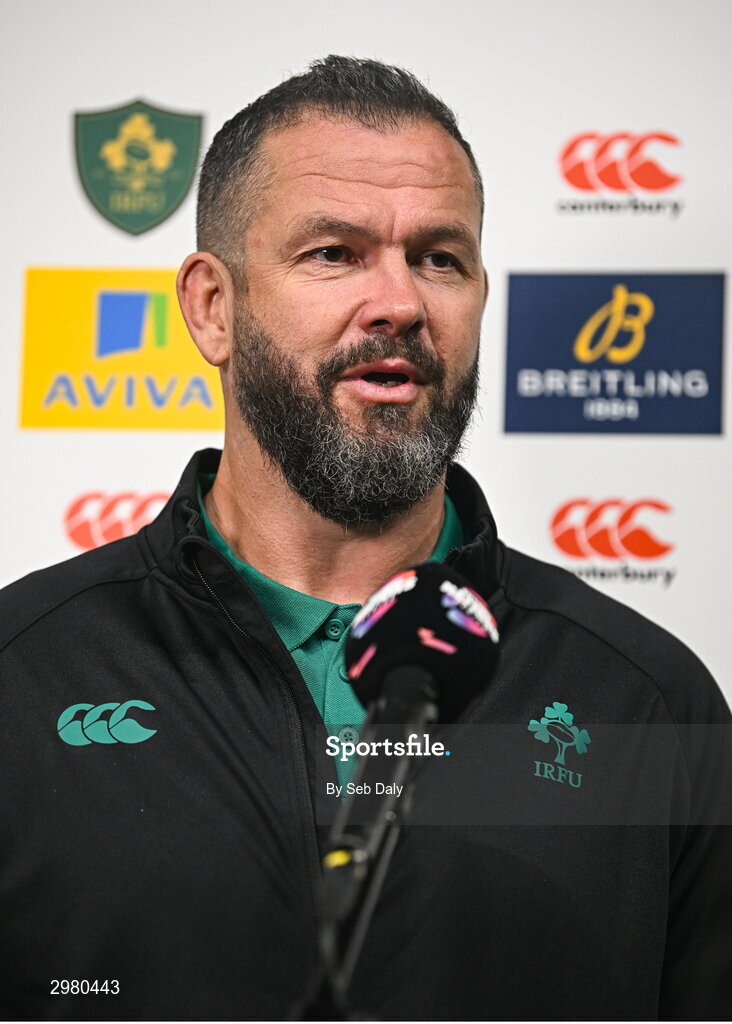 8 November 2024; Ireland head coach Andy Farrell is interviewed before the Autumn Nations Series match between Ireland and New Zealand at the Aviva Stadium in Dublin. Photo by Seb Daly/Sportsfile