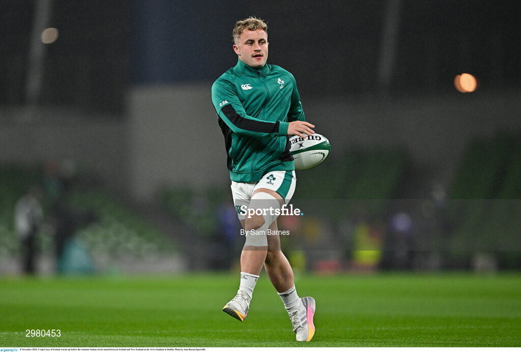 8 November 2024; Craig Casey of Ireland warms up before the Autumn Nations Series match between Ireland and New Zealand at the Aviva Stadium in Dublin. Photo by Sam Barnes/Sportsfile