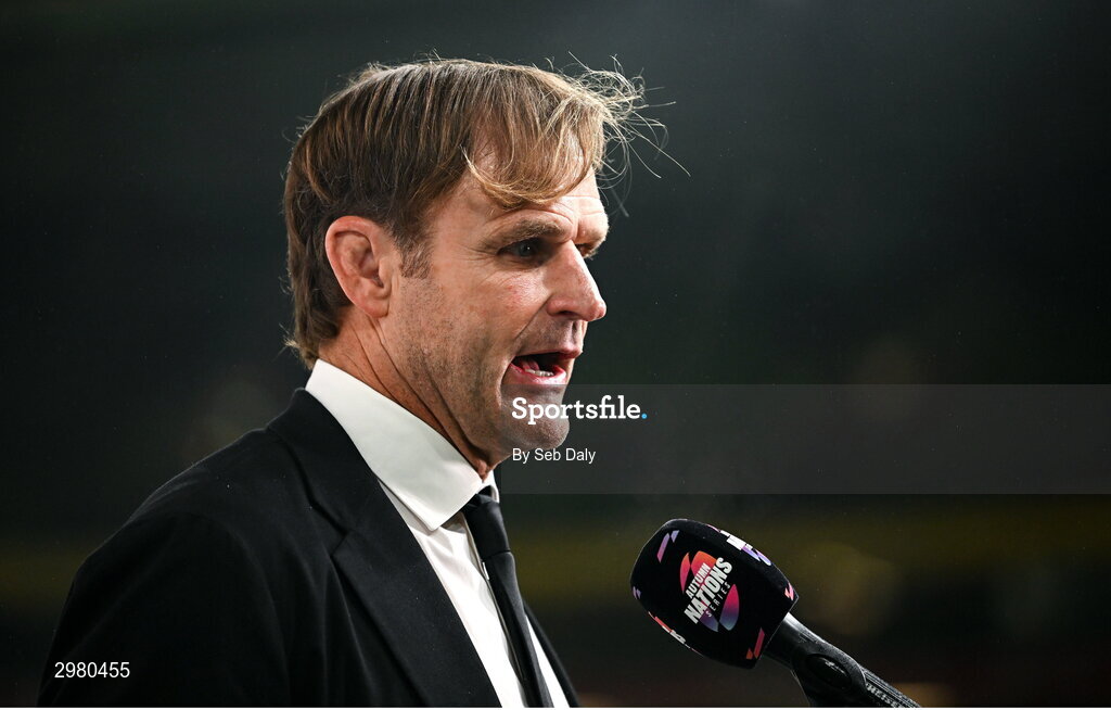 8 November 2024; New Zealand head coach Scott Robertson is interviewed before the Autumn Nations Series match between Ireland and New Zealand at the Aviva Stadium in Dublin. Photo by Seb Daly/Sportsfile