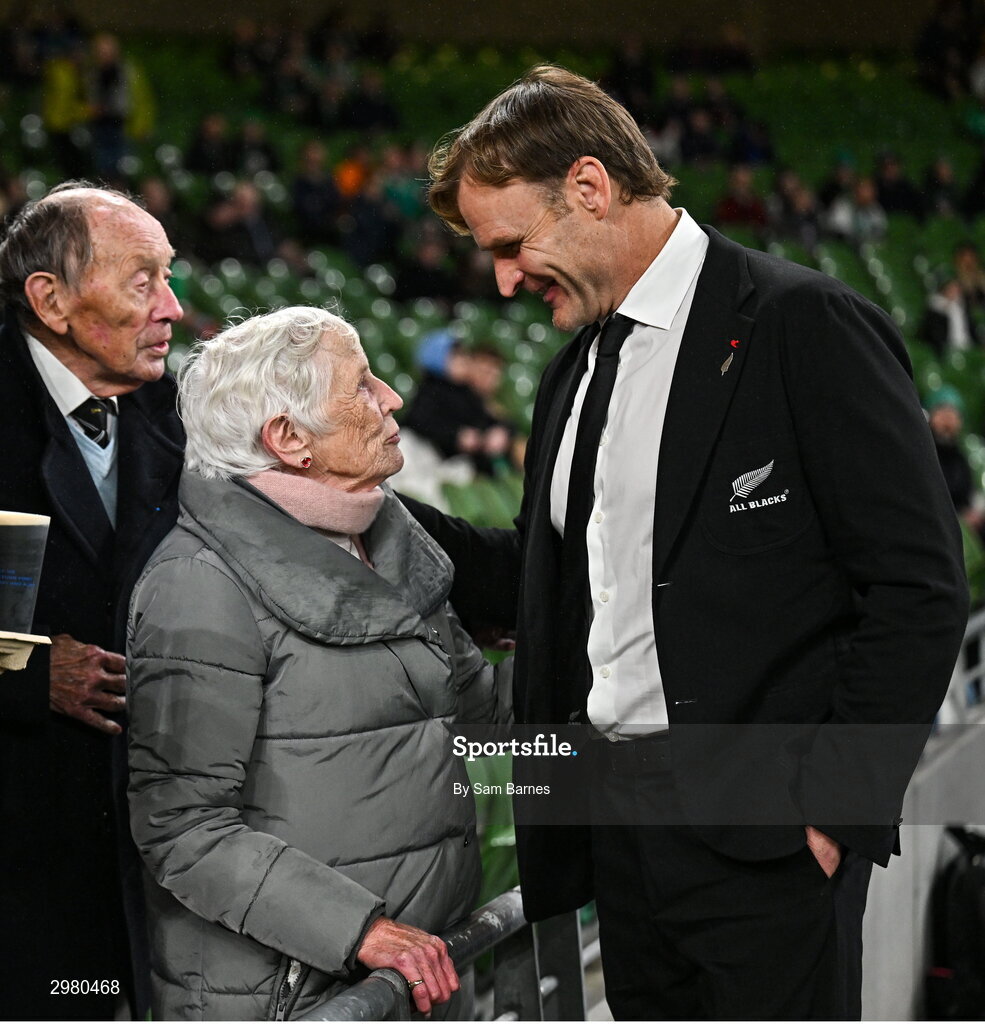 8 November 2024; New Zealand head coach Scott Robertson, right, reunites with his host family Ann and David Heron, 31 years after they welcomed him into their home for a rugby season, before the Autumn Nations Series match between Ireland and New Zealand at the Aviva Stadium in Dublin. Photo by Sam Barnes/Sportsfile