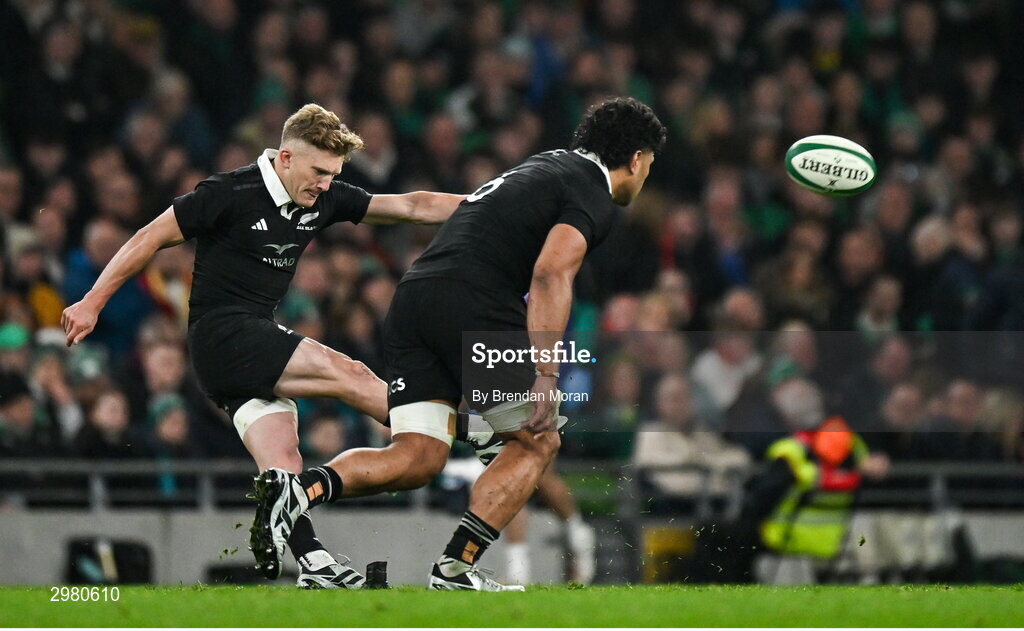 8 November 2024; Damian McKenzie of New Zealand kicks a penalty during the Autumn Nations Series match between Ireland and New Zealand at the Aviva Stadium in Dublin. Photo by Brendan Moran/Sportsfile