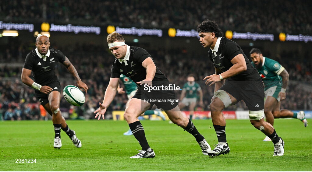 8 November 2024; Sam Cane of New Zealand gathers possession during the Autumn Nations Series match between Ireland and New Zealand at the Aviva Stadium in Dublin. Photo by Brendan Moran/Sportsfile
