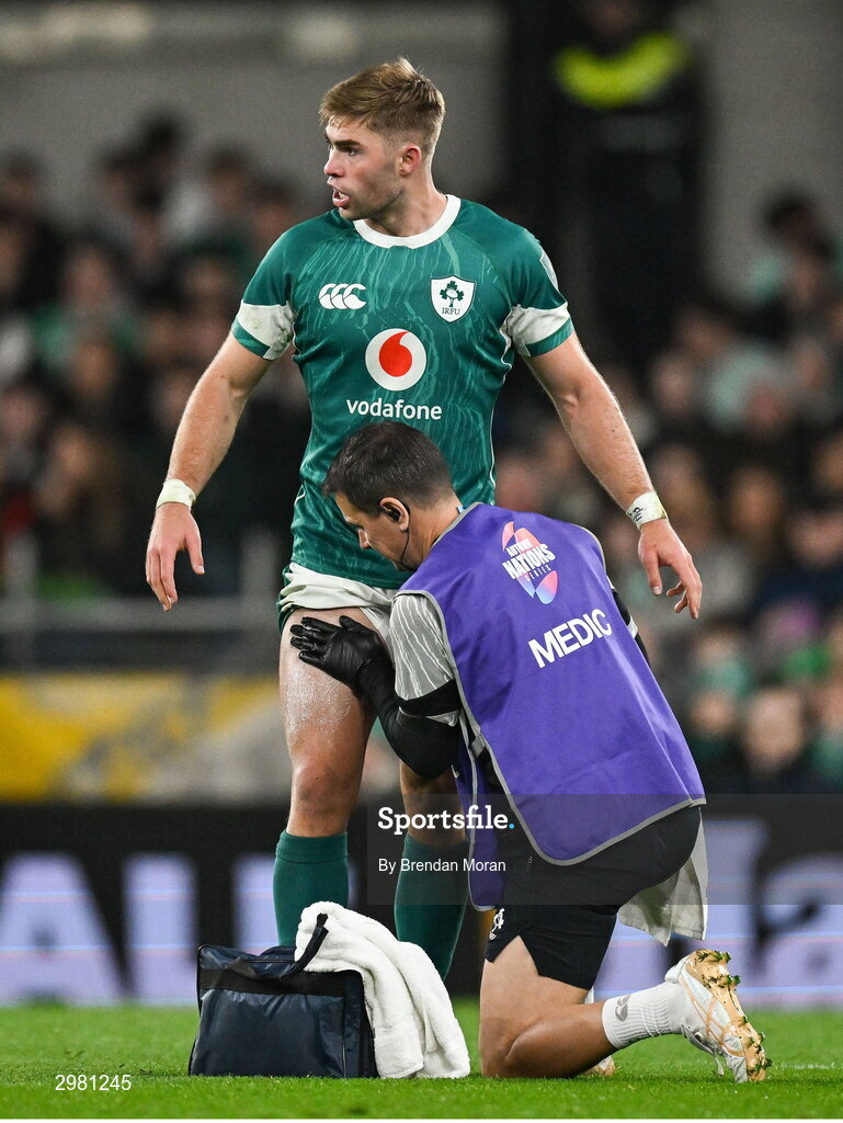 8 November 2024; Jack Crowley of Ireland receives medical treatment during the Autumn Nations Series match between Ireland and New Zealand at the Aviva Stadium in Dublin. Photo by Brendan Moran/Sportsfile