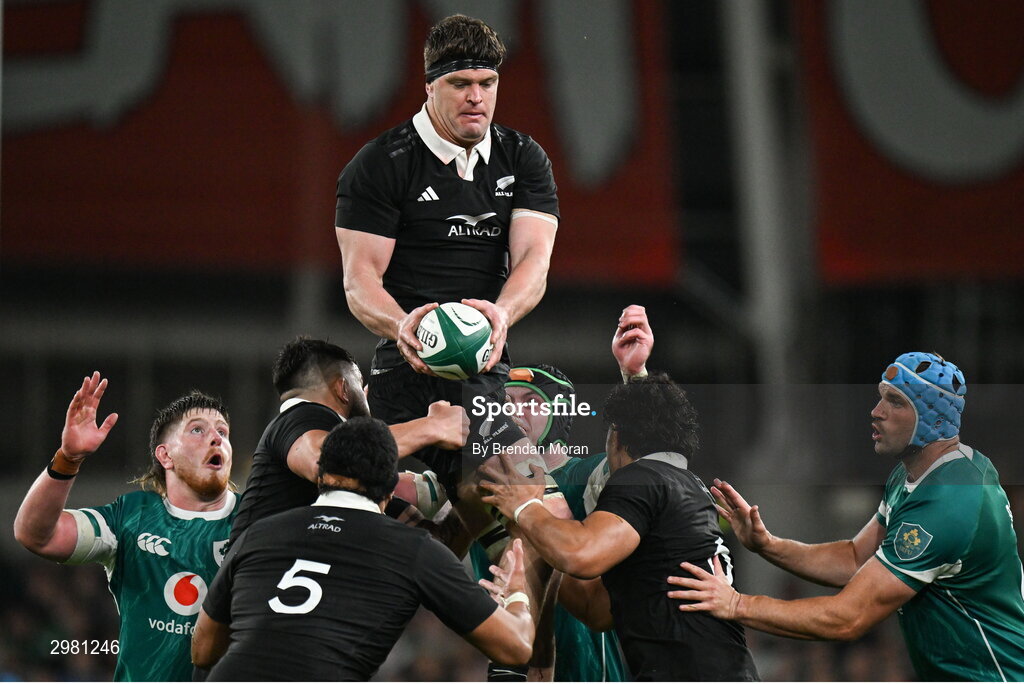 8 November 2024; Scott Barrett of New Zealand during the Autumn Nations Series match between Ireland and New Zealand at the Aviva Stadium in Dublin. Photo by Brendan Moran/Sportsfile