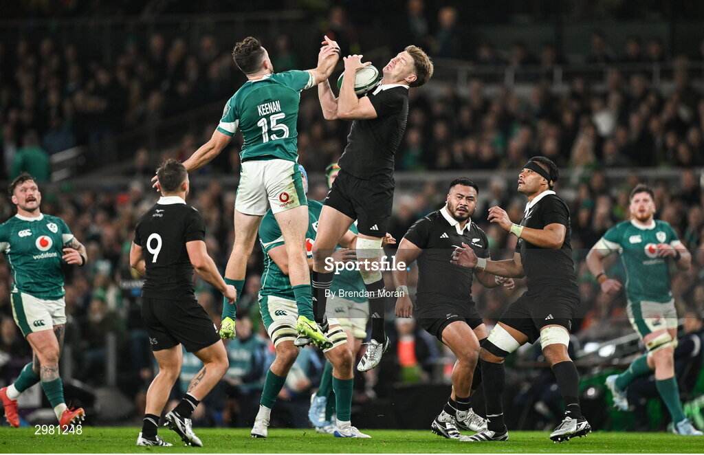 8 November 2024; Jordie Barrett of New Zealand and Hugo Keenan of Ireland contest a high ball during the Autumn Nations Series match between Ireland and New Zealand at the Aviva Stadium in Dublin. Photo by Brendan Moran/Sportsfile