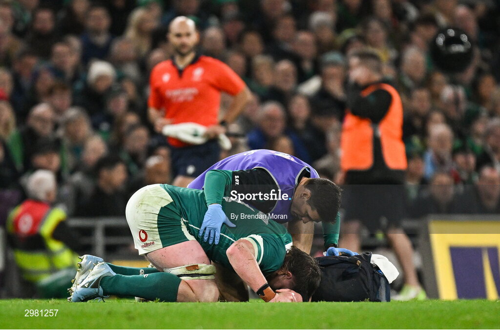 8 November 2024; Joe McCarthy of Ireland receives medical treatment during the Autumn Nations Series match between Ireland and New Zealand at the Aviva Stadium in Dublin. Photo by Brendan Moran/Sportsfile