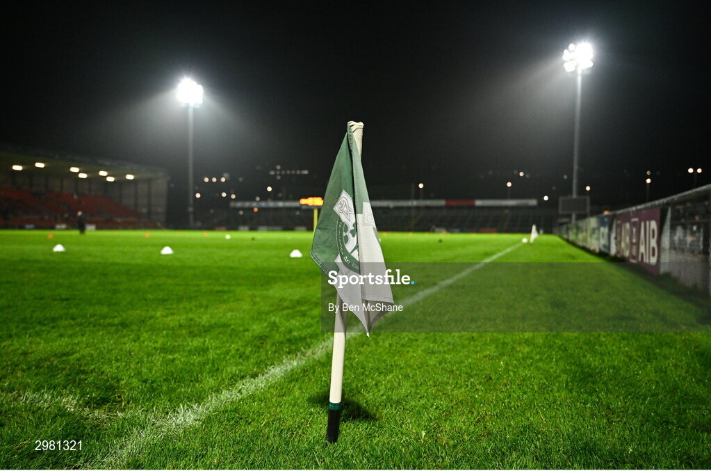 9 November 2024; A sideline flag is seen before the AIB Ulster GAA Senior Club Football Championship quarter-final match between Kilcoo and Crosserlough at Páirc Esler in Newry, Down. Photo by Ben McShane/Sportsfile