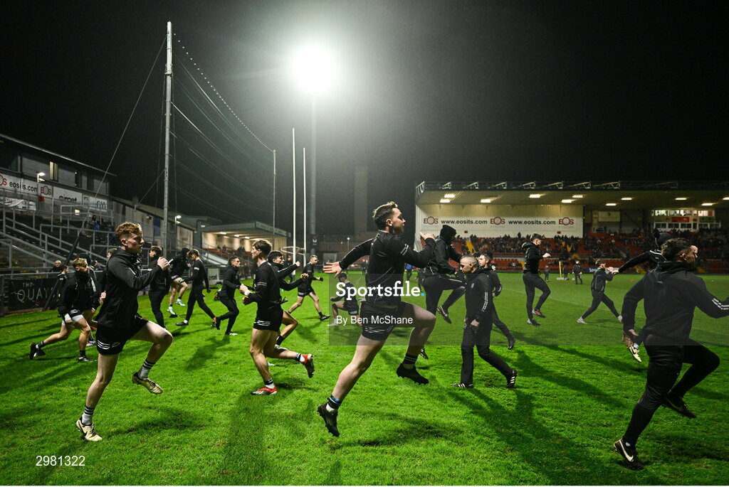 9 November 2024; Kilcoo players warm-up before the AIB Ulster GAA Senior Club Football Championship quarter-final match between Kilcoo and Crosserlough at Páirc Esler in Newry, Down. Photo by Ben McShane/Sportsfile