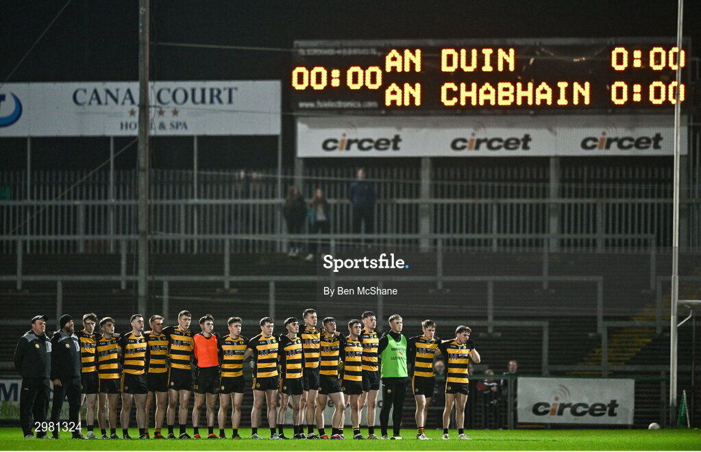 9 November 2024; Crosserlough players during the playing of Amhrán na bhFiann before the AIB Ulster GAA Senior Club Football Championship quarter-final match between Kilcoo and Crosserlough at Páirc Esler in Newry, Down. Photo by Ben McShane/Sportsfile