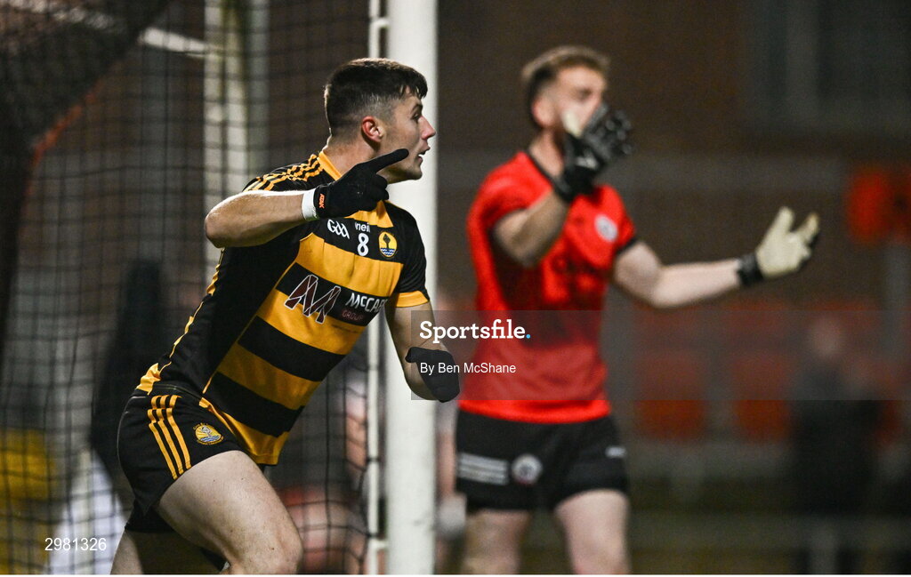 9 November 2024; James Smith of Crosserlough celebrates after scoring his side's first goal during the AIB Ulster GAA Senior Club Football Championship quarter-final match between Kilcoo and Crosserlough at Páirc Esler in Newry, Down. Photo by Ben McShane/Sportsfile