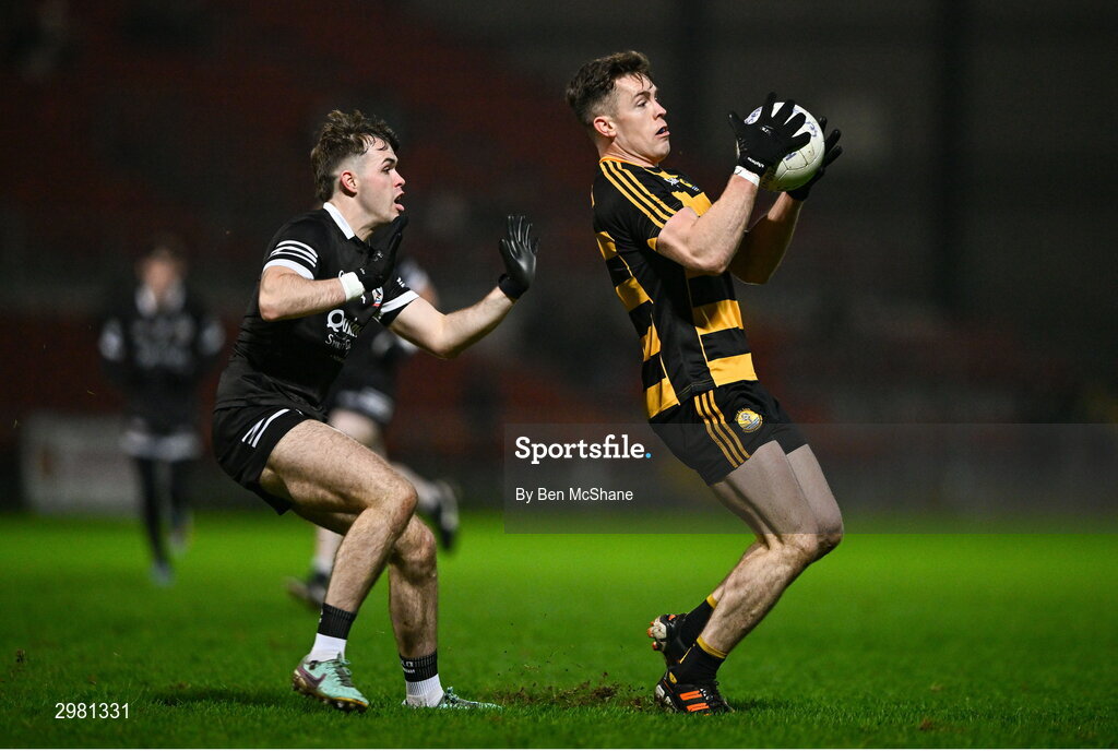 9 November 2024; Dara McVetty of Crosserlough in action against Callum Rogers of Kilcoo during the AIB Ulster GAA Senior Club Football Championship quarter-final match between Kilcoo and Crosserlough at Páirc Esler in Newry, Down. Photo by Ben McShane/Sportsfile