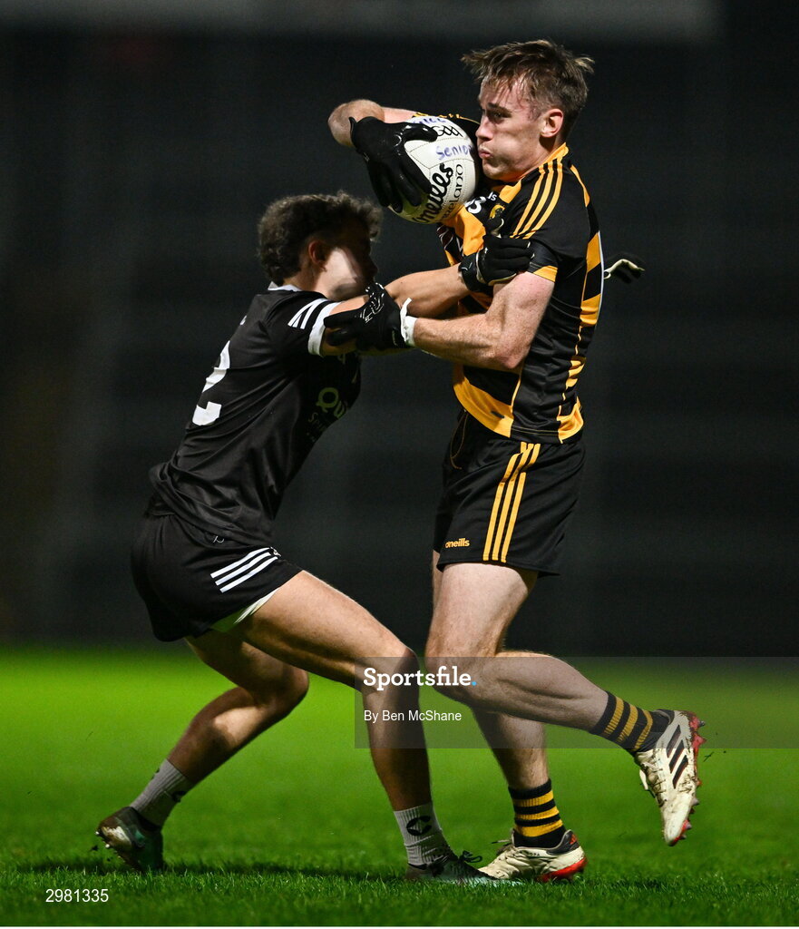 9 November 2024; Brandon Boylan of Crosserlough is tackled by Shealan Johnston of Kilcoo during the AIB Ulster GAA Senior Club Football Championship quarter-final match between Kilcoo and Crosserlough at Páirc Esler in Newry, Down. Photo by Ben McShane/Sportsfile