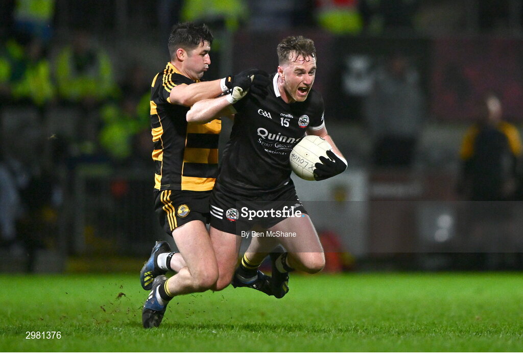 9 November 2024; Paul Devlin of Kilcoo is tackled by Patrick O'Reilly of Crosserlough during the AIB Ulster GAA Senior Club Football Championship quarter-final match between Kilcoo and Crosserlough at Páirc Esler in Newry, Down. Photo by Ben McShane/Sportsfile