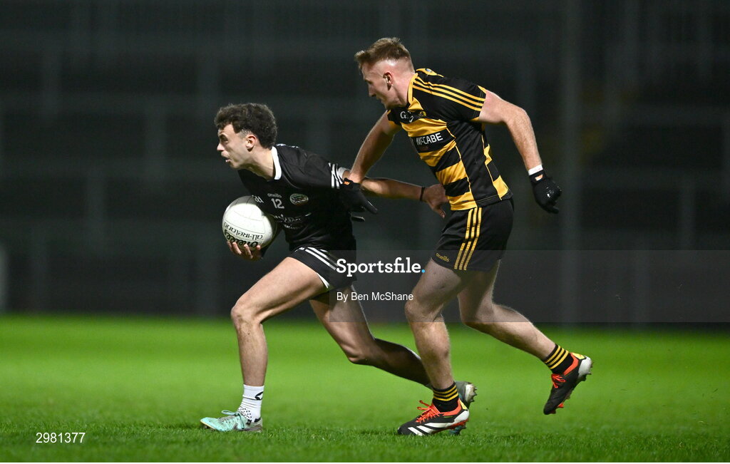 9 November 2024; Shealan Johnston of Kilcoo in action against Cian Boylan of Crosserlough during the AIB Ulster GAA Senior Club Football Championship quarter-final match between Kilcoo and Crosserlough at Páirc Esler in Newry, Down. Photo by Ben McShane/Sportsfile