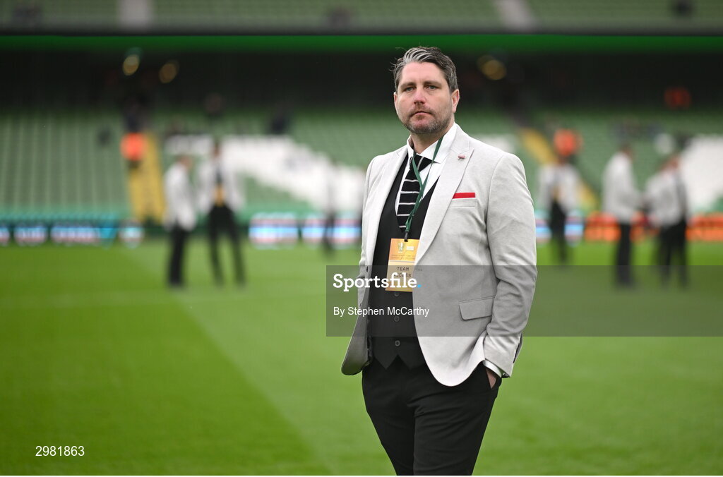 10 November 2024; Derry City manager Ruaidhrí Higgins walks the pitch before the Sports Direct Men's FAI Cup Final match between Drogheda United and Derry City at the Aviva Stadium in Dublin. Photo by Stephen McCarthy/Sportsfile