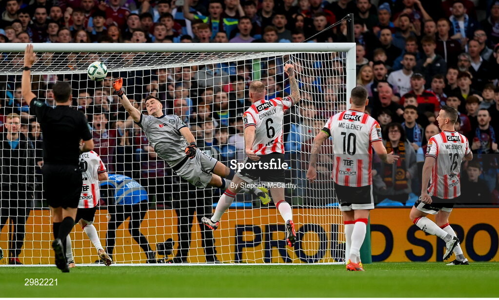 10 November 2024; Derry City goalkeeper Brian Maher makes a save as referee Rob Harvey signals for offside during the Sports Direct Men's FAI Cup Final match between Drogheda United and Derry City at the Aviva Stadium in Dublin. Photo by Stephen McCarthy/Sportsfile