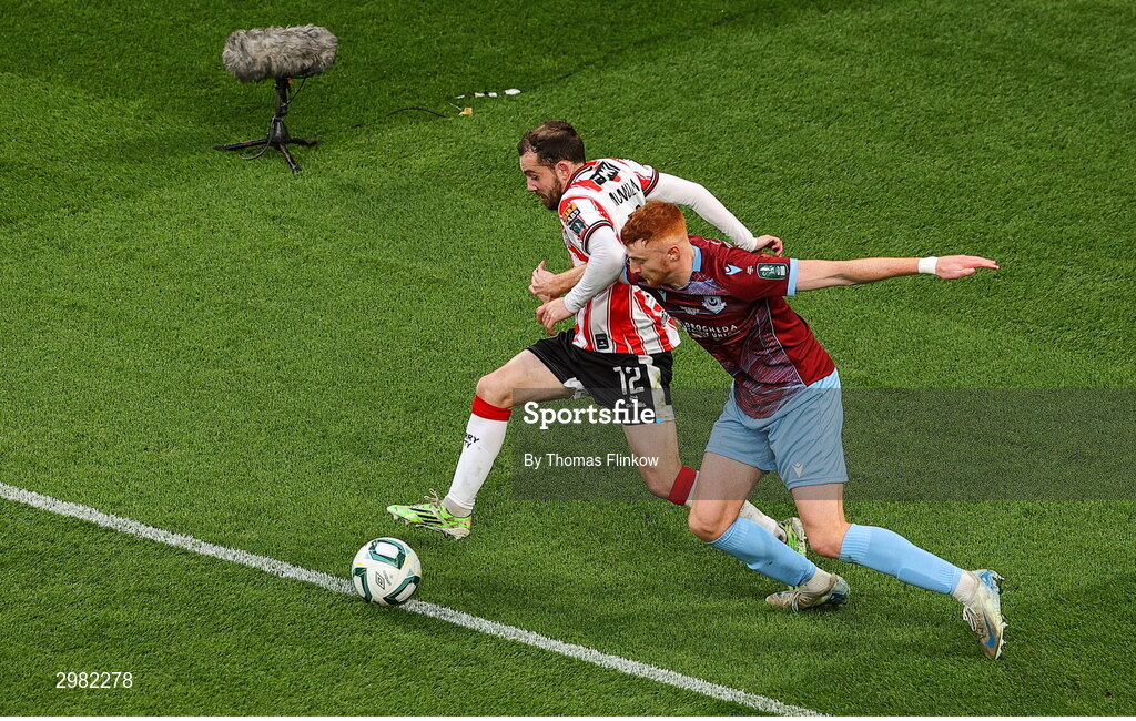 10 November 2024; Paul McMullan of Derry City in action against James Bolger of Drogheda United during the Sports Direct Men's FAI Cup Final match between Drogheda United and Derry City at the Aviva Stadium in Dublin. Photo by Thomas Flinkow/Sportsfile