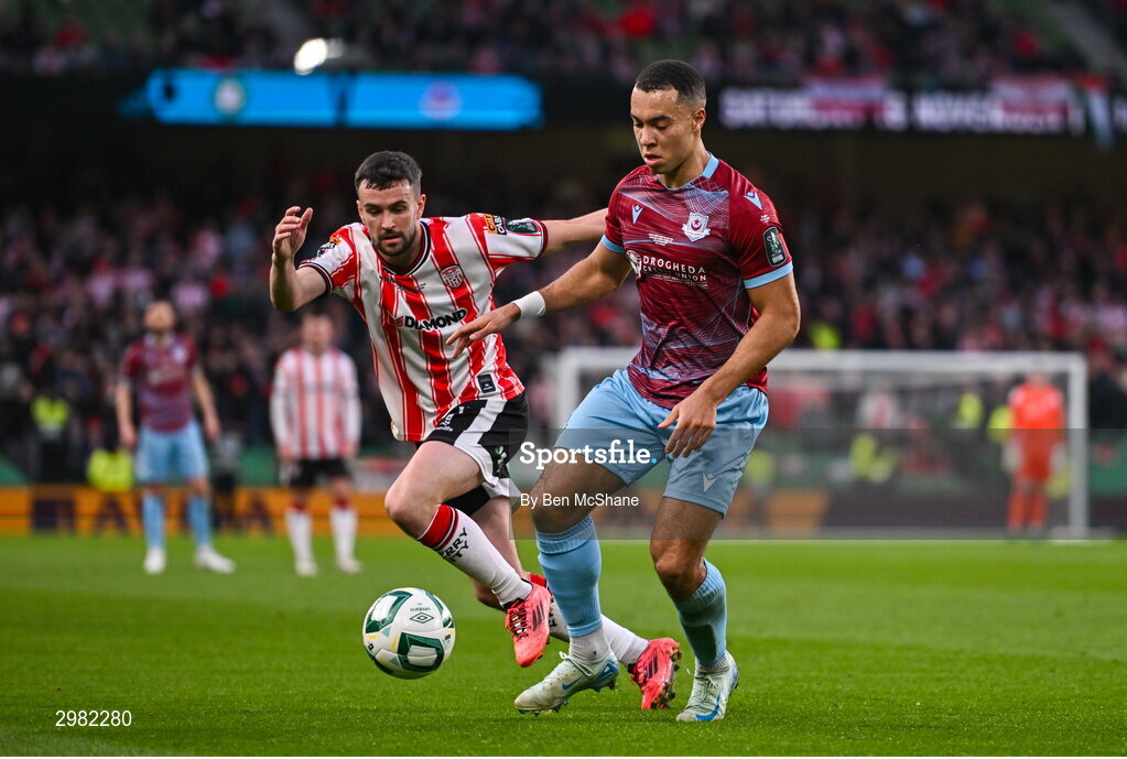 10 November 2024; Douglas James-Taylor of Drogheda United in action against Michael Duffy of Derry City during the Sports Direct Men's FAI Cup Final match between Drogheda United and Derry City at the Aviva Stadium in Dublin. Photo by Ben McShane/Sportsfile