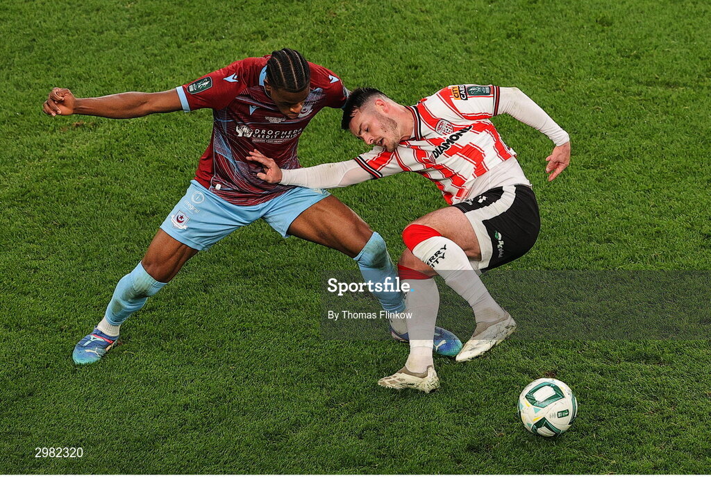 10 November 2024; Danny Mullen of Derry City is tackled by Elicha Ahui of Drogheda United during the Sports Direct Men's FAI Cup Final match between Drogheda United and Derry City at the Aviva Stadium in Dublin. Photo by Thomas Flinkow/Sportsfile