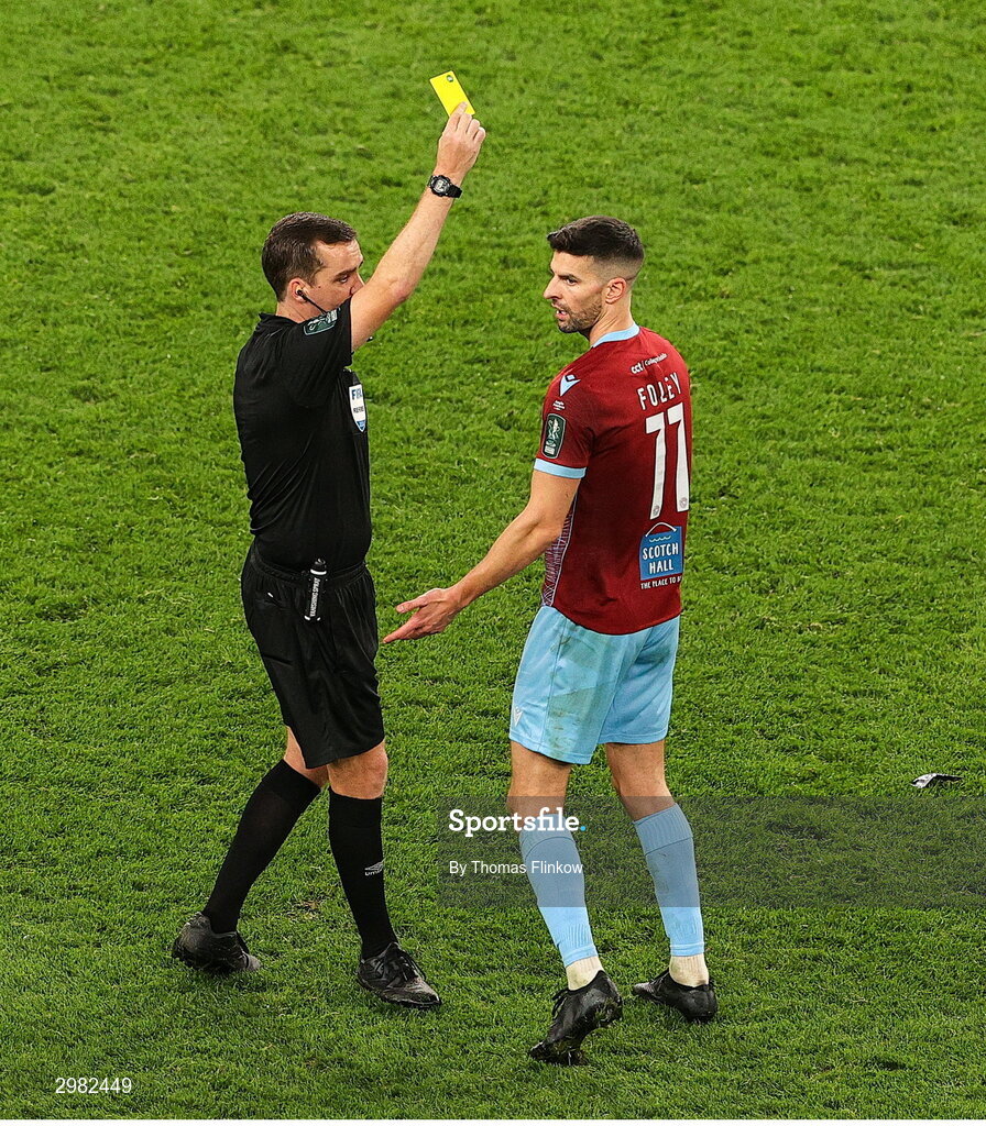 10 November 2024; Adam Foley of Drogheda United is shown a yellow card by referee Rob Harvey during the Sports Direct Men's FAI Cup Final match between Drogheda United and Derry City at the Aviva Stadium in Dublin. Photo by Thomas Flinkow/Sportsfile