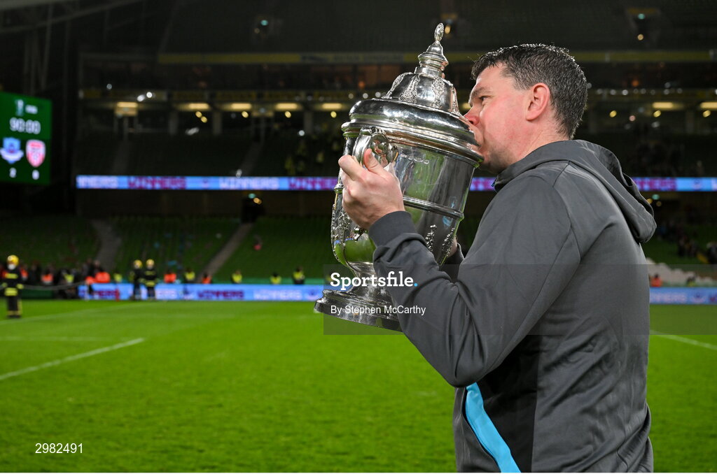 10 November 2024; Drogheda United manager Kevin Doherty celebrates with the FAI cup after the Sports Direct Men's FAI Cup Final match between Drogheda United and Derry City at the Aviva Stadium in Dublin. Photo by Stephen McCarthy/Sportsfile