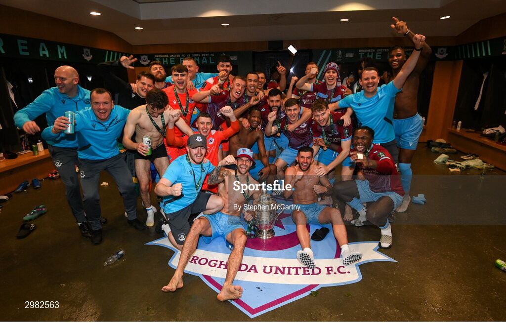 10 November 2024; The Drogheda United team celebrate with the FAI cup in the dressingroom after the Sports Direct Men's FAI Cup Final match between Drogheda United and Derry City at the Aviva Stadium in Dublin. Photo by Stephen McCarthy/Sportsfile