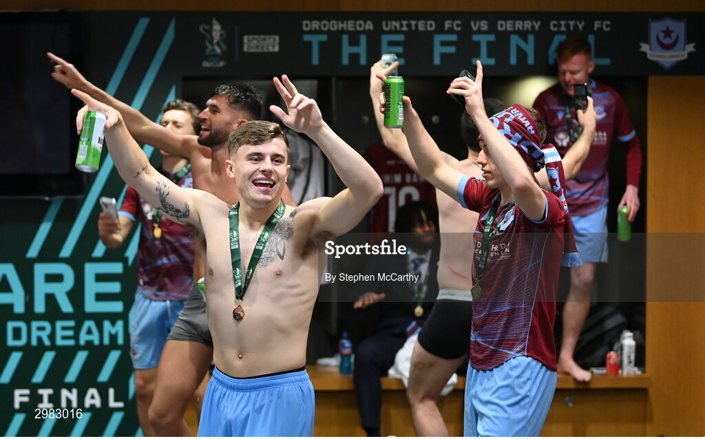10 November 2024; Aaron McNally of Drogheda United celebrates in the dressing room with team-mates after the Sports Direct Men's FAI Cup Final match between Drogheda United and Derry City at the Aviva Stadium in Dublin. Photo by Stephen McCarthy/Sportsfile