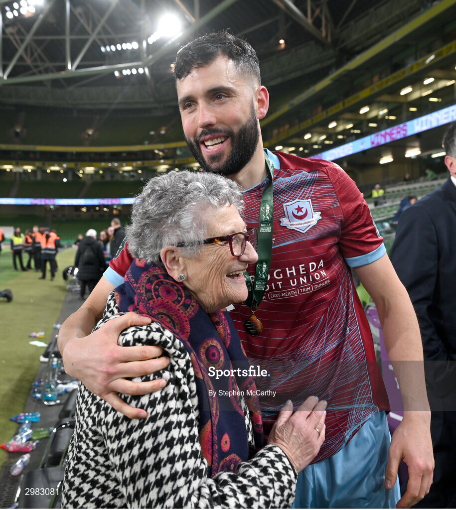 10 November 2024; Dave Webster of Drogheda United with his grandmother Rita after the Sports Direct Men's FAI Cup Final match between Drogheda United and Derry City at the Aviva Stadium in Dublin. Photo by Stephen McCarthy/Sportsfile