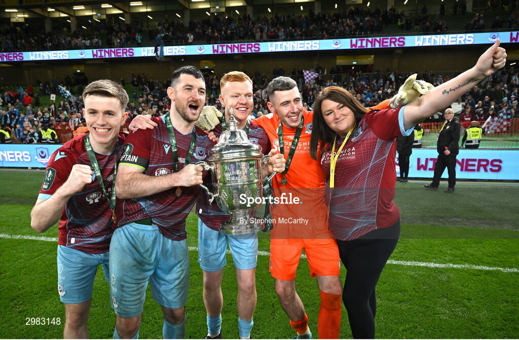 10 November 2024; Drogheda United players, from left, Warren Davis, Ryan Brennan, Shane Farrell, Luke Dennison and chairperson Joanna Byrne after the Sports Direct Men's FAI Cup Final match between Drogheda United and Derry City at the Aviva Stadium in Dublin. Photo by Stephen McCarthy/Sportsfile