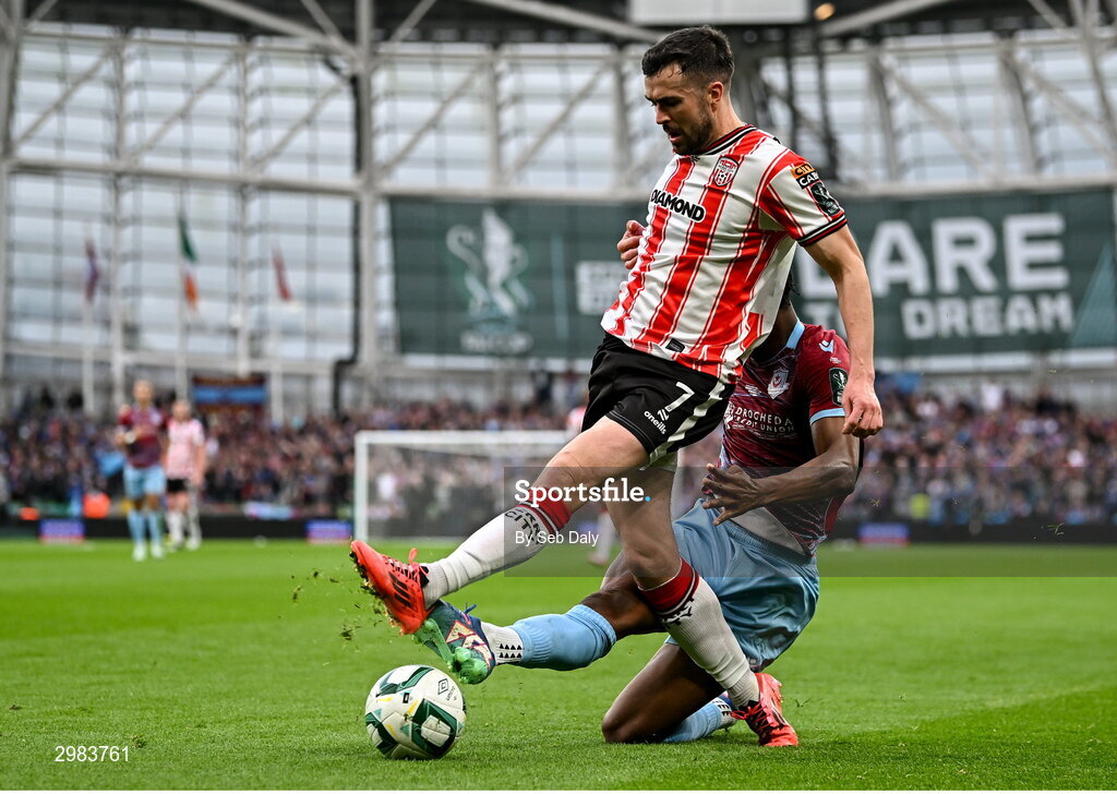 10 November 2024; Michael Duffy of Derry City is tackled by Elicha Ahui of Drogheda United during the Sports Direct Men's FAI Cup Final match between Drogheda United and Derry City at the Aviva Stadium in Dublin. Photo by Seb Daly/Sportsfile