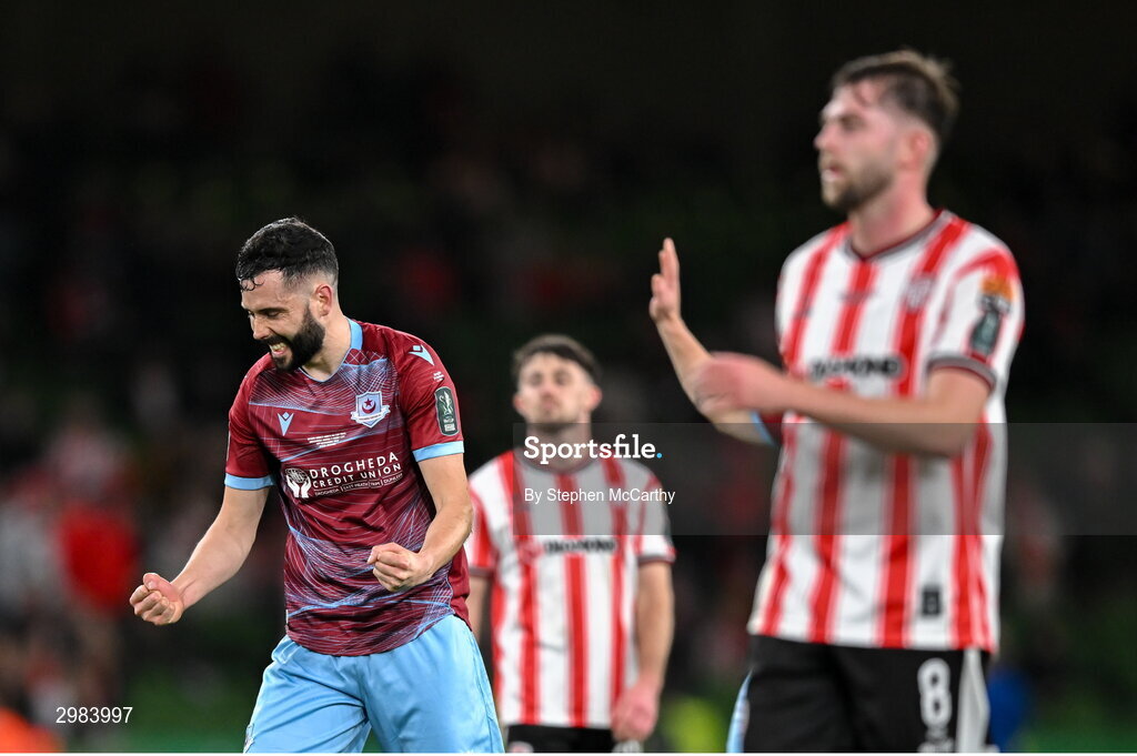 10 November 2024; Dave Webster of Drogheda United celebrates during the closing moments of the Sports Direct Men's FAI Cup Final match between Drogheda United and Derry City at the Aviva Stadium in Dublin. Photo by Stephen McCarthy/Sportsfile